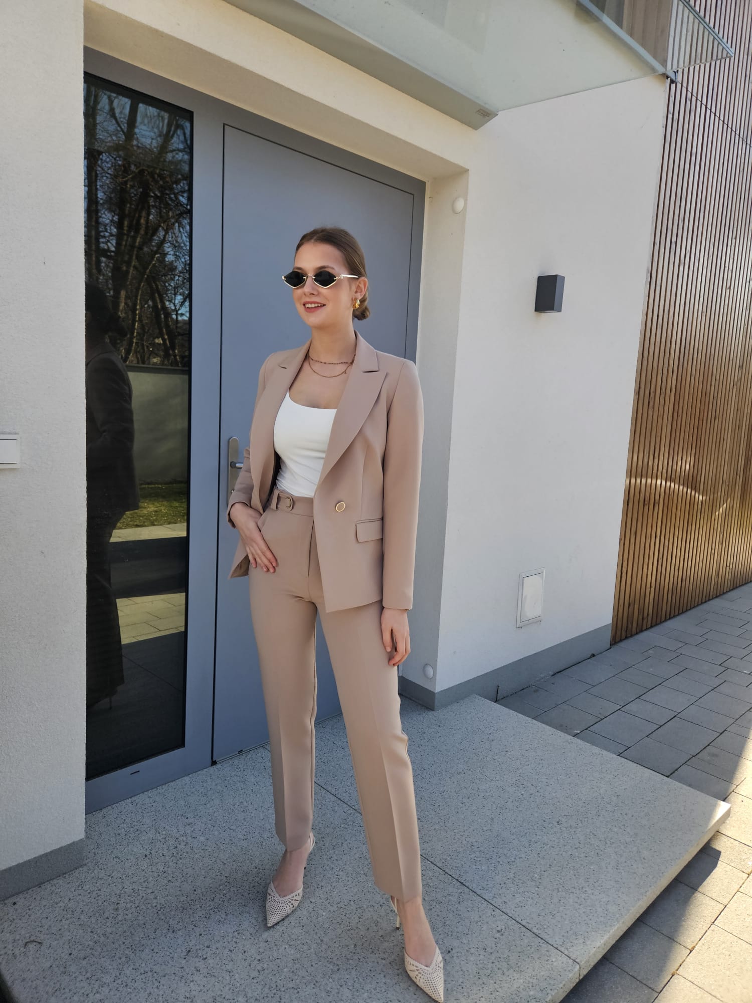 Eleganckie beżowe spodnie w kantkę to kwintesencja stylu i nowoczesnej elegancji. Uszyte z wysokiej jakości materiału, prezentują się niezwykle szykownie, łącząc w sobie klasykę z nutą współczesnego designu. Jasny, beżowy odcień nadaje im lekkości i świeżości, idealnie komponując się z wiosennymi i letnimi stylizacjami. Spodnie z wysokim stanem, który pięknie podkreśla talię i optycznie wydłuża nogi, nadając sylwetce smukłości. W pasie ozdobione są biżuteryjnymi guzikami, które stanowią elegancki akcent całej stylizacji. Starannie wykonane, z delikatnym połyskiem, guziki te dodają spodniom luksusowego charakteru, przyciągając wzrok i podkreślając ich wyjątkowy design. Prosty krój nogawek w kantkę nadaje spodniom formalnego i jednocześnie nowoczesnego wyglądu.. Z tyłu wszyta jest elastyczna guma, dzięki której spodnie idealnie dopasowują się do sylwetki, zapewniając jednocześnie wygodę noszenia i swobodę ruchów. To praktyczne rozwiązanie sprawia, że spodnie świetnie leżą na różnych typach figur, zachowując elegancki wygląd przez cały dzień. Te spodnie doskonale komponują się z żakietem do kompletu w tej samej kolorystyce.