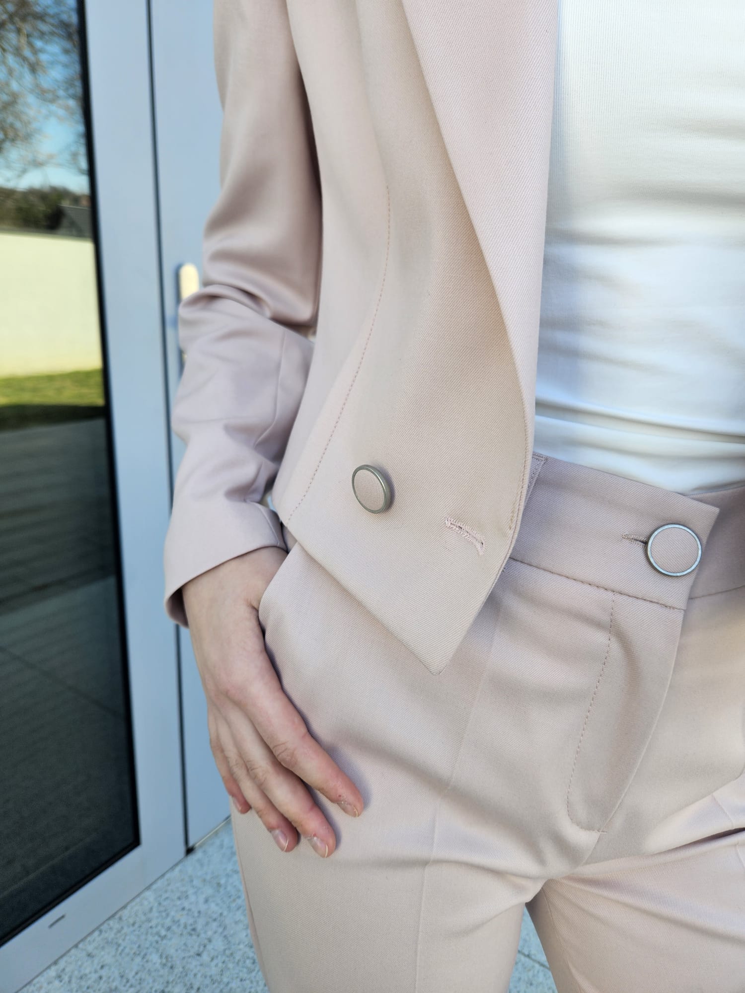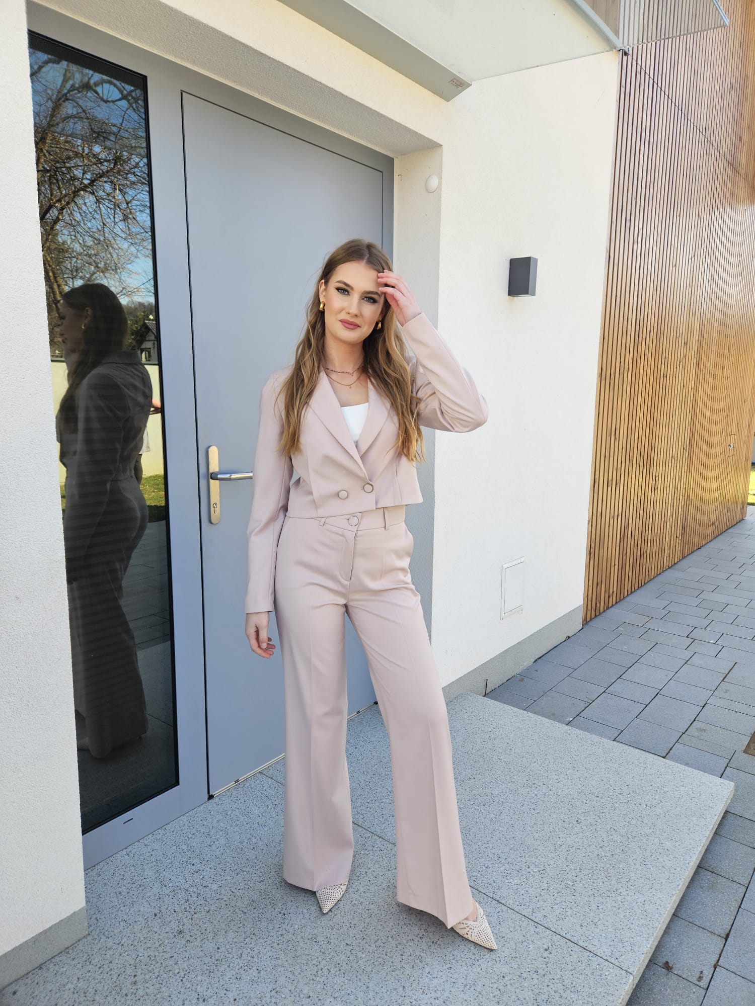 Elegancki żakiet damski o krótkim kroju w odcieniu pudrowego różu to esencja wyrafinowanego stylu i klasycznej elegancji. Uszyty z wysokogatunkowej tkaniny prezentuje się niezwykle szykownie i gustownie. Krótki fason kończący się w okolicach talii podkreśla sylwetkę i optycznie wydłuża nogi. Jego jasny odcień wprowadza świeżość do każdej stylizacji, pięknie podkreślając cerę i nadając całości lekkości. Żakiet jest zapinany na ozdobne guziki, które stanowią jego prawdziwą ozdobę. Starannie wykonane, z delikatnym połyskiem dodają mu luksusowego charakteru. Ten model żakietu doskonale komponuje się ze spodniami w tej samej kolorystyce tworząc nietuzinkowy komplet. Idealny na formalne spotkania, uroczyste okazje czy biznesowe wyjścia, doda każdej stylizacji szyku i elegancji.