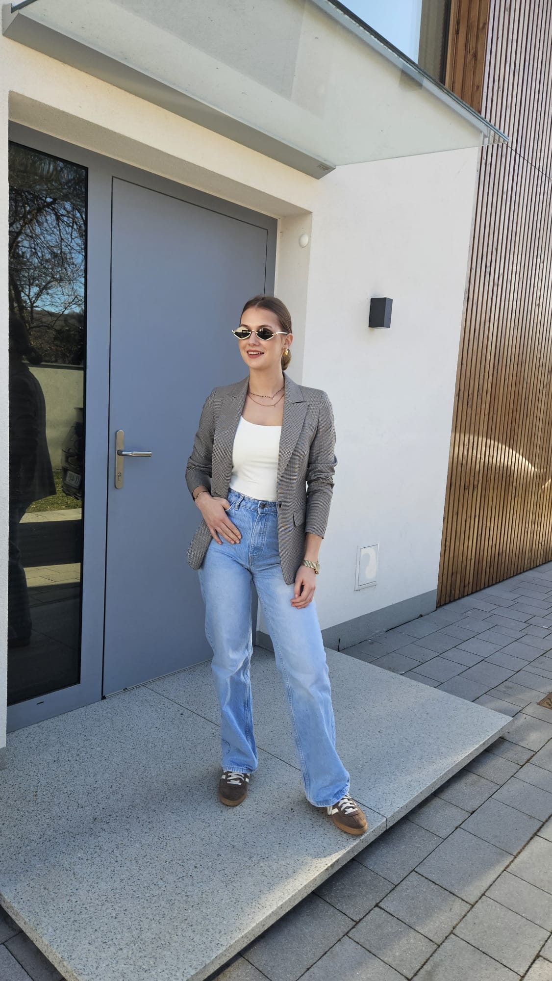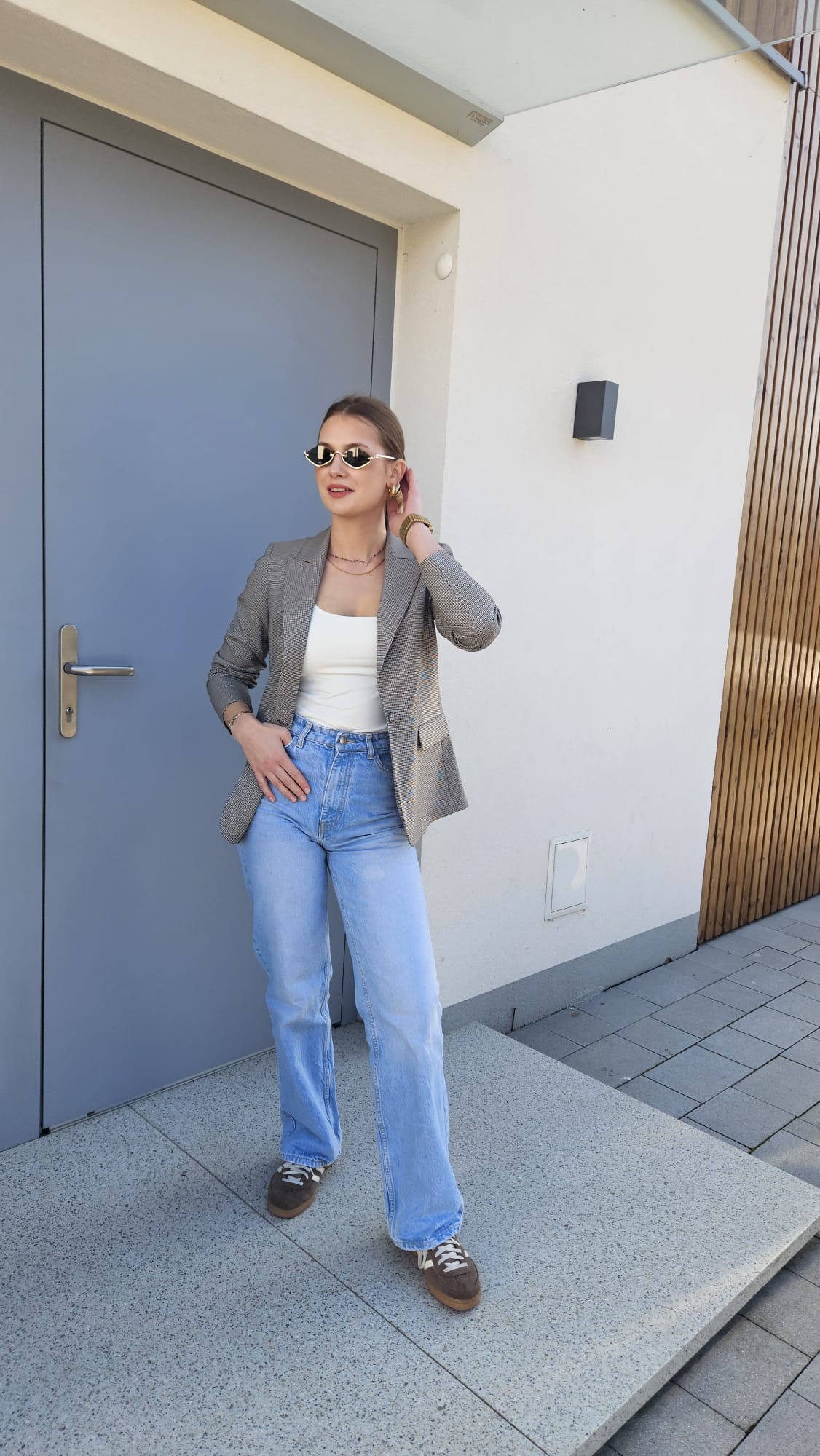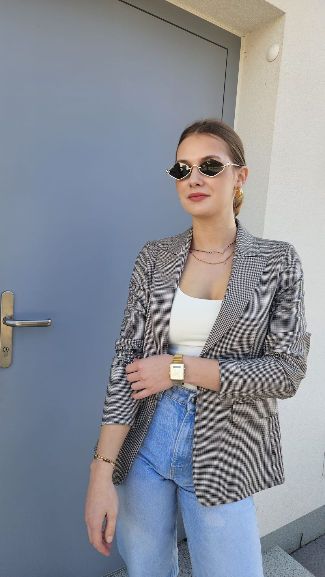 Klasyczny damski żakiet w odcieniu szarości zdobiony brązową pepitką to ponadczasowy element garderoby, który łączy elegancję z subtelnym wzornictwem. Starannie skrojony fason pięknie układa się na sylwetce, a zapięcie na guzik w tym samym kolorze podkreśla spójny charakter całości. Stonowana kolorystyka sprawia, że żakiet doskonale komponuje się zarówno z klasycznymi, jak i nowoczesnymi stylizacjami – świetny wybór do pracy, spotkań biznesowych czy eleganckich zestawów na co dzień.